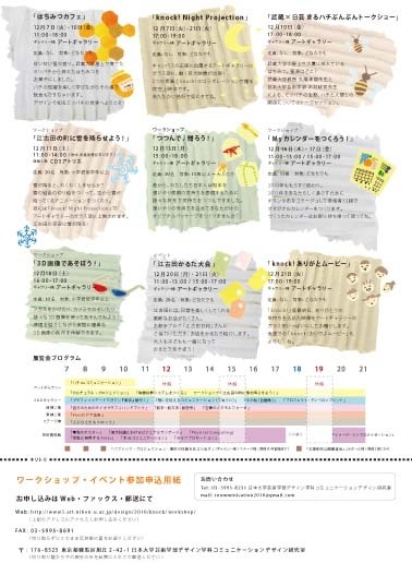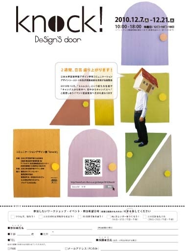 -------------------------------------------------- 日本大学芸術学部デザイン学科 コミュニケーションデザイン展 「knock!」Design's door 2010. 12. 7 - 21 -------------------------------------------------- 2・3年生主催の展覧会です。 デザイン&アート系のイベント・ワークショップが盛りだくさん。 全部無料なので、ぜひ参加してください! "遊べる展覧会" knock! をよろしくね! -------------------------------------------------- 【knock! オフィシャルサイト】 ■PCの方はこちらから http://www