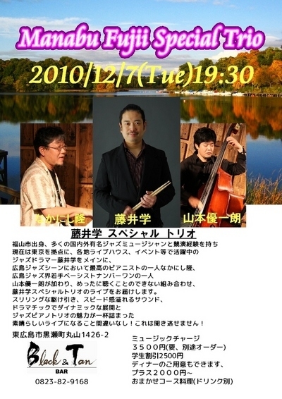 2010/12/7(火) 「藤井学スペシャルトリオ Black&Tan ライブ」 福山市出身、多くの国内外 有名ジャズミュージシャンと競演経験を持ち 現在は東京を拠点に、 各地ライブハウス、イベント等で活躍中の ジャズドラマー藤井学をメインに、 広島ジャズシーンにおいて 最高のピアニストの一人なかにし隆、 広島ジャズ界若手ベーシストナンバーワンの一人 山本優一朗が加わり、 めったに聴くことのできない組み合わせ、 藤井学スペシャルトリオのライブをお届けします。 スリリングな駆け引き、スピード感溢れるサウンド、