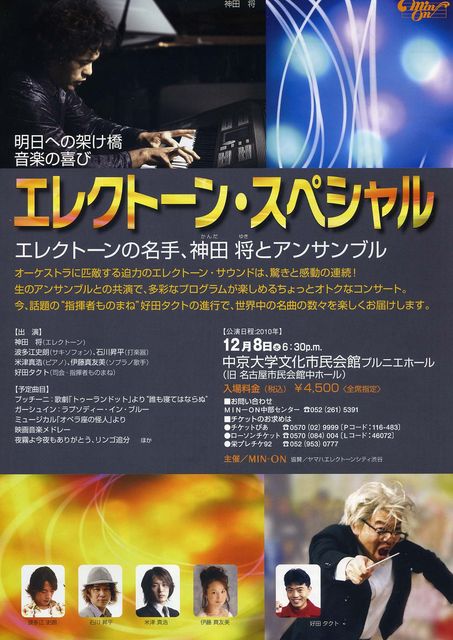 『神田将とアンサンブル エレクトーン・スペシャル』 2010年12月8日(水)開場: 18:00 開演: 18:30 座席: 全席指定:4,500円(税込) 会場: 中京大学文化市民会館 プルニエホール(愛知県) 問合せ先: 052-261-5391 完売しました!