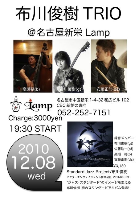 名古屋JAZZ好きのみなさま、こんばんは! ライブの告知をさせて下さい。 12月8日、布川俊樹TRIOが新栄Lampに初登場します。 布川俊樹(gt)TRIO,安藤正則(ds),高瀬裕(b) charge:3000yen/19:30〜2stages 【名古屋 LAMP】 052-252-7151 名古屋市中区新栄1-4-32和広ビル102 CBC新館の東向のビル http://aox.jp/lamp/ 一昨年、布川氏の長いキャリアで初のスタンダード集を発売しました。 今回のライブでは収録曲や布川オリジナルなどを演奏する予定です。 布川俊樹StandardJazzProject http://www.jvcmusic.co.jp/-/Discography