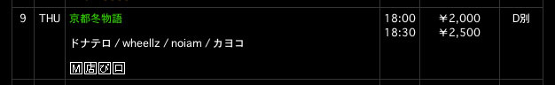★2010年12月9日(木) 『京都冬物語』 会場/KYOTO MUSE 〒600-8006 京都市下京区四条通柳馬場西入 ミューズ389京都 阪急京都線烏丸駅13番出口より、左手3件目すぐ http://www.arm-live.com/muse/kyoto/ 出演/カヨコ、ドナテロ、wheellz、noiam 開場18:00/開演18:30 前売¥2,000/当日¥2,500(D別) ■LIVE INFORMATION■|「カヨコの戯言」より http://ameblo.jp/kayokobeya/entry-10582244188.html ※詳細は、カヨコオフィシャルサイトにてご確認ください。 カヨコ OFFICIAL WEB SITE http://www.kayoko-web.com/