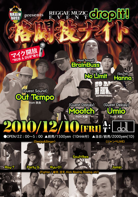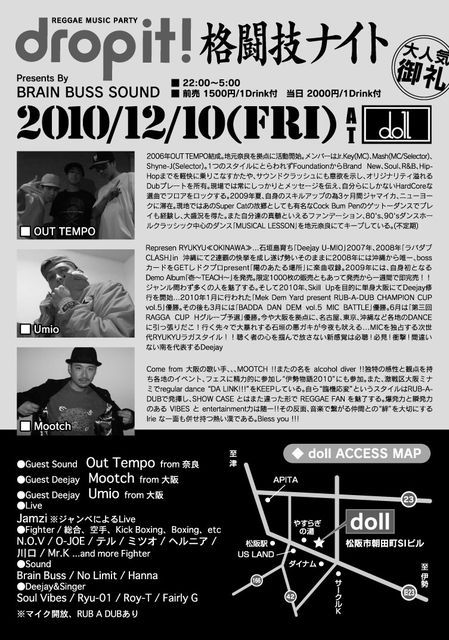 初!三重県にU-MIO出没☆ 【drop it〜格闘技 Night〜】 12/10(金曜日) @doll(松阪市朝田町SIビル1F) 22:00〜5:00 前売り:1500円/1drink付 当日:2000円/1drink付 (Guest Sound) Out Tempo from 奈良 (Guest Deejay) Mootch from 大阪 U-MIO from 沖縄 (Live) Jamzi(ジャンベによるLive) (Fighter / 総合、空手、Kick Boxing、Boxing、etc) N.O.V O-JOE テル ミツオ ヘルニア 川口 Mr.K and more Fighter (Sound) Brain Buss No Limit Hanna (Deejay&Singer) Soul Vibes