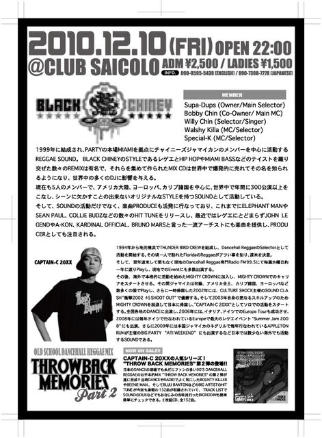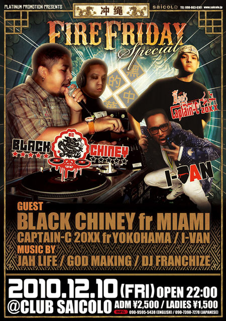 入場料 男性2500円 女性1500円 サウンド ☆BLACK CHINEY (fr:マイアミ) ☆CAPTAIN-C 20XX(fr:横浜) ☆GOD MAKING ☆JAH LIFE VDJ ☆DJ FRANCHIZE