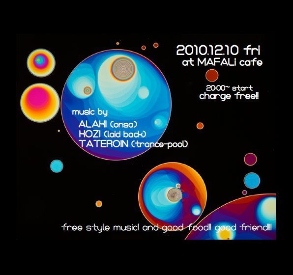 みなさんこんにちは。 ご無沙汰しております。Trance-PoolのTateroinです。 引越しから海外への長旅という流れで あまりコチラに顔が出せませんでした・・ごめんなさい。 ようやく最近沖縄に落ち着いたところです。 さて、今週の金曜日に那覇の『マファリカフェ』にて ゆっくりナイトカフェでお食事やお茶を楽しんでいるみなさまと 音楽でご一緒させていただく企画のお誘いを受けましたので ご紹介させていただきます。 2010.12.10 fri@MAFALi cafe 20:00〜start charge free!!! music by ALAKI(onsa) KOZI(laid back) TATEROIN(