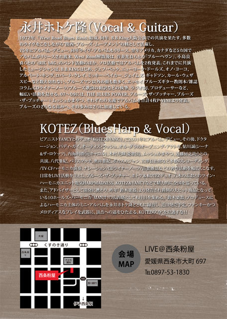 告知失礼します。 鈴木楽器プレゼンツによるブルースハープ付きCD『ブルースハーモニカの扉』リリースツアー、愛媛は西条”粉屋”に初登場。 デュオ・スタイルによるライヴです。 鈴木楽器『ブルースハーモニカの扉』特設ページをご覧下さい。↓↓↓ http://www.suzuki-music.co.jp/special/blues_harmonica/ 永井ホトケ隆&KOTEZデュオ Live at 西条粉屋 2010/12/12(土) 18:30オープン/19:00スタート 前売¥3000/当日¥3500 (1ドリンク付き) 西条粉屋 愛媛県西条市大町697 ?0897-53-1830 参考URL:http://r.ta