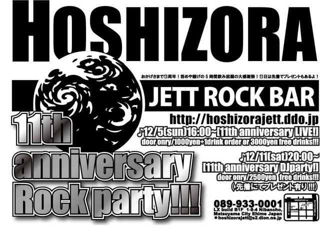 「HOSHIZORAJETT ROCK BAR 11th anniversary DJ party!」 Dj's.. TAKENAKA(irie time) みやちゃん(Nn~DURA) ハレンチ(ハレンチヘアー) HAMUSUKE(from宮崎) マサキアコースティック IKAWAX(Radical Face) ヒロセプロ ノブディラン(湊町コーヒーブルース) バーン(スーパーサイクロン) cut tac cut(Warld Is Mine) MORIKAWA チェルシー(chelsea) door only/2500yen 5h FREE DRINK!!! ※先着にてプレゼント有り! おかげさまで星空ジェット11周年!呑めや騒げの5時間飲み放題の大感謝祭! オールナイトで踊って潰れてください