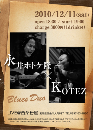 告知失礼します。 鈴木楽器プレゼンツによるブルースハープ付きCD『ブルースハーモニカの扉』リリースツアー、愛媛は西条”粉屋”に初登場。 デュオ・スタイルによるライヴです。 鈴木楽器『ブルースハーモニカの扉』特設ページをご覧下さい。↓↓↓ http://www.suzuki-music.co.jp/special/blues_harmonica/ 永井ホトケ隆&KOTEZデュオ Live at 西条粉屋 2010/12/12(土) 18:30オープン/19:00スタート 前売¥3000/当日¥3500 (1ドリンク付き) 西条粉屋 愛媛県西条市大町697 ?0897-53-1830 参考URL