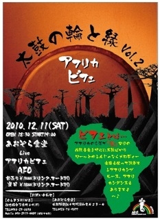 太鼓の輪と緑vol.2 アフリカのマリの伝統楽器を中心に太鼓ばかりではなくメロディー楽器も使って演奏する アフリカンブルース アフリカンダンスもあります 前売り¥1500(ドリンク、フード別) 当日 ¥1800(ドリンク、フード別) お問い合わせ OLDSHINE 佐世保市下京町6−9(1F) TEL0956-23-6636 あおぞら食堂 北松浦郡佐々町羽須和免423−4 TEL0956-76-9677