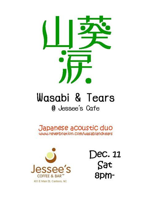A Japanese acoustic duo, "Wasabi & Tears' is playing lots of Japanese songs at Jessee's Cafe on 11 Dec.