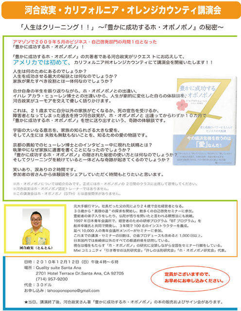 ★当日、講演終了後、河合政実さん著「豊かに成功するホ・オポノポノ」の本の販売およびサイン会があります。