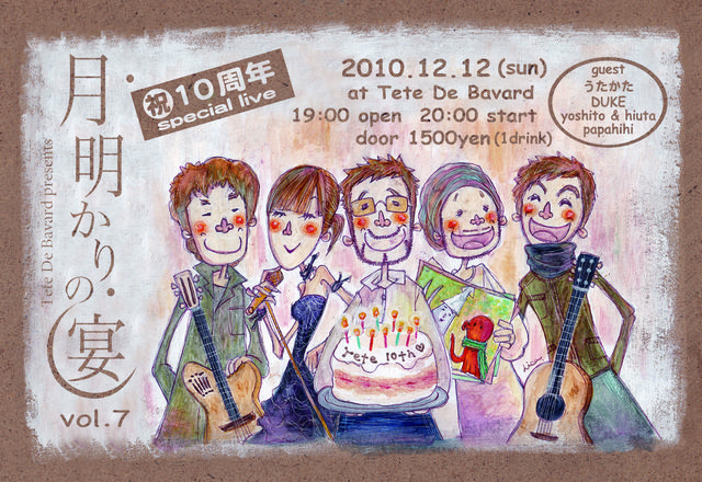 12月15日、カフェ・テテドババールが10周年を迎えます。 これを祝い、毎月行っているイベント、月明かりの宴でspecial live を開催いします。 ゲストは、よしととひうた・うたかた・DUKE です。 是非、一緒に10周年を祝いましょう!! 2010.12.12(sun) 19:00 open 20:00start 1500yen(1drink付) + ???