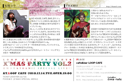 管理人さま告知お願いいたします。 THAMII 初仙台LIVE決定!!!! ★LOOPCAFE PRESENTS X'MAS PARTY★ 『THAMII & 石川コウ SPECIAL LIVE』 12月14日(火)OPEN 19:00 2000YEN 1DRINK FOOD X'MAS SPECIAL MENU ステージは2回予定してますので、遅い時間の方も是非。 詳細はお問い合わせください。 loopcafe902@yahoo.co.jp LOOP CAFE 宮城県仙台市泉区八乙女中央1−6−15 2F 022−773-3736 HP http://www.loopcafe.net/ BLOG http://ameblo.jp/loopcafe/