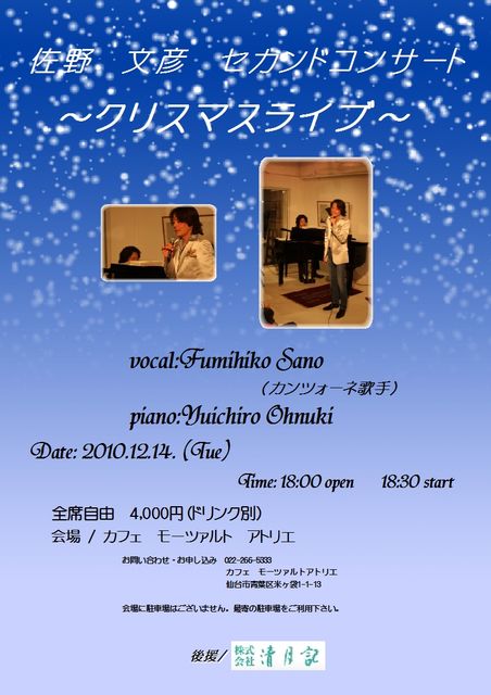 管理人さま 告知失礼いたします 佐野文彦さん 仙台セカンドコンサート のお知らせ 佐野文彦セカンドコンサート クリスマスライブ 12月14日(火) 18:00〜OPEN 18:30〜STERT チケット\4000(ドリンク別) カフェ モーツアルトアトリエ 022-266-5333 佐野文彦さんが仙台でクリスマスライブを行います 前回5月のアトリエでのライブでもチケット好評完売した佐野文彦さん 次はいつですか?という皆様の熱い声にお応えして12月にクリスマスライブで 佐野文彦さんが再び仙台に