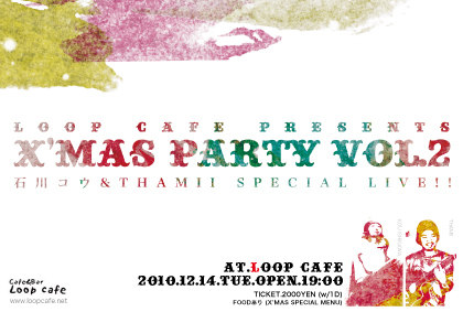 管理人さま告知お願いいたします。 THAMII 初仙台LIVE決定!!!! ★LOOPCAFE PRESENTS X'MAS PARTY★ 『石川コウ & THAMII SPECIAL LIVE』 12月14日(火)OPEN 19:00 2000YEN 1DRINK FOOD X'MAS SPECIAL MENU ステージは2回予定してますので、遅い時間の方も是非。 詳細はお問い合わせください。 loopcafe902@yahoo.co.jp LOOP CAFE 宮城県仙台市泉区八乙女中央1−6−15 2F 022-773-3736 HP http://www.loopcafe.net/ BLOG http://ameblo.jp/loopcafe/