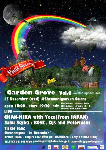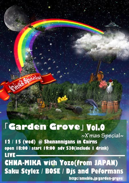 【Garden Grove】 オーストラリアのケアンズを中心に、日本人主催で毎回日本からのゲストを迎えるライブイベント。 バンドはもちろん、トークライブ、ライブペインティングなど、誰にでも楽しめる様々なイベントを企画中! ケアンズという町を自分たちやアーティスト達がリラックスできる庭の様な環境にして、そこで自由に創作、表現し、それをまた誰にでもシェアできる居心地の良い場所作りを目指しています。 このようなイベントを立ち上げました。 第1弾としてケアンズにて12/15(Wed)にクリスマスライブイベントを開催します。 メイ