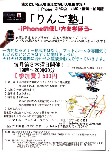 12月16日の木曜日19時〜 小松市北浅井町 ダイイチビルで「りんご塾」というタイトルで iPhoneのユーザー座談会的なイベントがあります。 iPhoneお持ちの方は是非もて来ていただいて、 アプリ仲間をつくったり、 田舎って電波とかないじゃん談義に花を咲かせませんか?w もちろん、iPhoneお持ちじゃなくても iPodtouchでアプリを活用している人や、 iPhoneほしーよー><って思ってる方も大歓迎です。 いろいろ情報交換しましょう。参加費は500円です。 申込は私に直メッセないしは、添付のチラシデータに書いてある メール