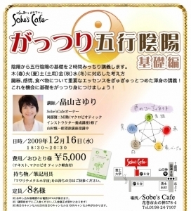 陰陽から五行陰陽の基礎を2時間みっちり講義します。 木(春)火(夏)土(土用)金(秋)水(冬)に対応した考え方 臓器、感情、食べ物について重要なエッセンスを ぎゅぎゅっとつめた渾身の講義!これを機会に基礎をがっつり身につけましょう! 講師 畠山さゆり Sobe'sCafeオーナー 岡部賢二MI塾(マクロビオティックインストラクター養成講座)修了 山村慎一郎望診講座受講中 日時 2009年12月16日(水) 18:30〜20:30 定員 8名様 費用 お一人様5,000円(テキス