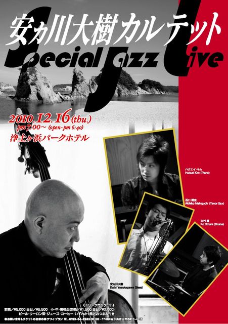 管理人様、前回の告知のお許し大変ありがとうございました。 今年もまたジャズ・ライブの告知のお許しを頂ければ幸いです。 今回はクリスマスより少し早めの日時になりますが、よろしくお願い致します。 皆様のご来場、心よりお待ちいたします。 【安ヵ川大樹カルテット】 安ヵ川 大樹 (Bass) http://yasu.office-gen.com/ 西口 明宏 (Tenor Sax) http://www.akihironishiguchi.com/site/Top.html ハクエイ・キム (Piano) http://www.myspace.com/hakueikim 大村 亘 (Drums) http://www.myspace.com/ko