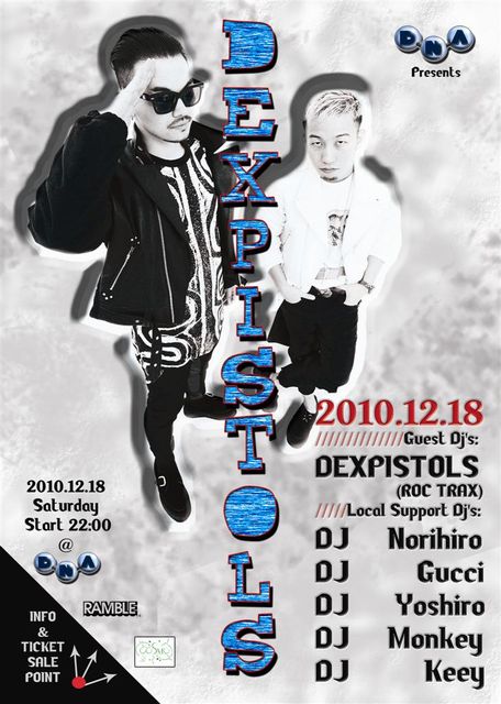 DEXPISTOLS 来鳥です!! 2010年12月18日土曜日@DNA 22:00 前売り 3000円(W1D) 当日 3500(W1D) Guest Dj DEXPISTOLS(ROC TRAX) Djs NORIHIRO GUCCI YOSHIRO MONKEY KEEY