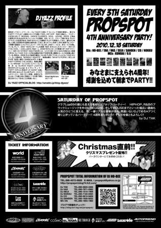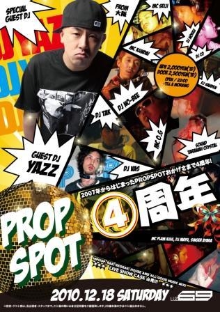 PROPSOT 4周年 - THE TOTTORI NO.1 HIPHOP PARTY EVERY 3rd SATURDAY !!- ■2010/12./18 sat OPEN/START 22:00- ■@LUZ69 HOTな第3土曜日isBack!! ついについに 4TH ANNIVERSARY PARTY !!!!!! BIGなゲストを招いてのBIGなBIGなANNIVERSARY PARTY !!!!!! ■SPECIAL GUEST DJ YAZZ (from 大阪) 関西きってのハードワーカーDJ YAZZ!! 大阪にて DJとして活動を開始し、様々なPARTYでPLAYし着実にキャリアを築いてきた。HIP HOP・R&Bを軸とし、フロアーの状況に応じてREGGAE・DANCE CLASSICS・SOUL・HOU
