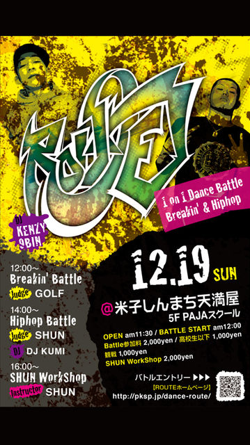 ROUTE 1on1DanceBattle 12月19日(日) 米子天満屋 パジヤカルチャー MC ATSUSI Breakin'Battle 1200〜 Judge GOLF DJ 9BIN HipHopBattle 1400〜 Judge SHUN DJ KUMI Entry2000円 高校生以下1000円 観戦1000円 SHUNWorkSHOP 1600〜 HipHop 料金2000円 定員残18名 申し込み http://pksp.jp/dance-route/