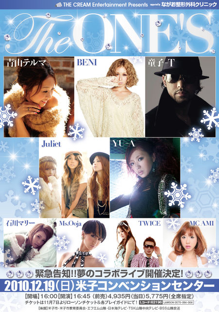 THE CREAM ENTERTAINMENT PRESENTS THE ONE'S supported by ながお整形外科クリニック 12月19日(日) 開演 16:30 前売4,935(税込)当日5,775(税込) ★一般発売:ロ−ソンチケット0570-084-006 (Lコ−ド:62196) プレイガイド:米子/米子コンベンションセンター・BOOK YARD 全店/ EL PAPA / ブックセンターコスモ 米子 / Oasis 松江/STUDIO WONDER SATY店/田和山店 出雲/ブックセンターコスモ 出雲店 CAST 青山テルマ BENI 童子-T Juliet YU-A Ms Ooja 石川マリ− TWICE 後援:米子市・米子市教育委員会・エフエム山陰・TSK山陰中央テレビ・