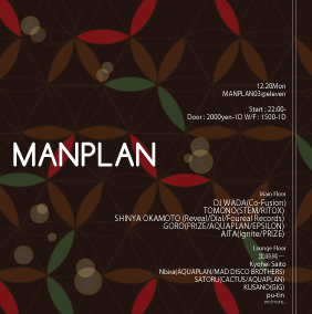管理人様、告知失礼致します。 12.20Mon MANPLAN03@eleven Start : 22:00- Door : 2000yen-1D W/F : 1500-1D ※ 下記URLよりフライヤー画像をプリントアウトして頂くとW/F料金にてご入場頂けます。是非ご利用下さい。 http://go-to-eleven.com/schedule/detail/198/2010/12 Main Floor DJ WADA(Co-Fusion) TOMONO(STEM/RITOX) SHINYA OKAMOTO (Reveal/Dial/Foureal Records) GORO(PR!ZE/AQUAPLAN/EPSILON) AITA(ignite/PR!ZE) Lounge Floor 黒崎純一 Kyohei Saito Nbira(AQUAPLAN/MAD DISCO BROTHERS) SA