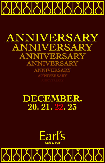 いよいよです。 12月22日で2周年を迎えます。 皆様の暖かい支えでここまでやって来れました。 感謝感謝の気持ちとしまして、20日から23日までAnniversary Days開催!!! 期間中のキャンペーン内容です↓↓↓ 1) ジントニック/ハイボール 半額!! 2) 期間中はホクホクのチップスが300円!! 3) ランチタイム限定!焼きたてスコーンお一人様1個サービス!! <ランチメニューご注文のお客様に限らせて頂きます。> 4) 抽選でEarl'sアニバーサリーTシャツやオリジナルCDプレゼント!! <2,000円以上飲食して頂いた方に限らせて