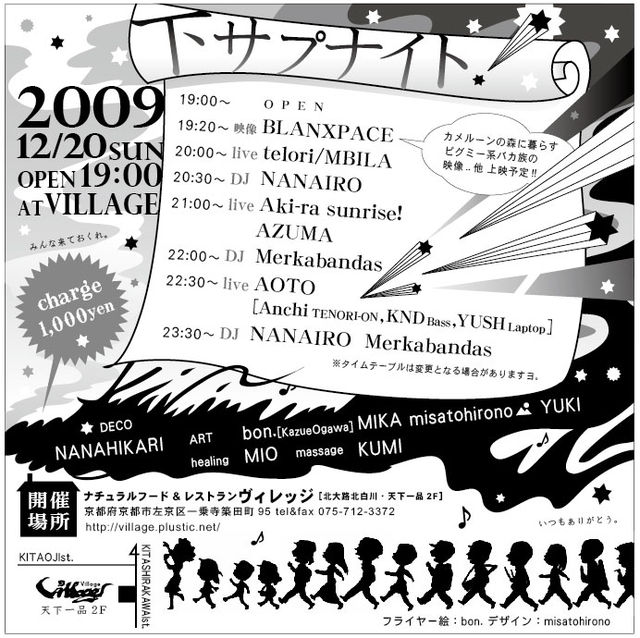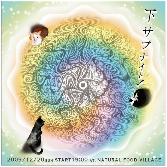 △▽△▽△▽△▽△▽△▽△▽△▽△▽△▽△▽△▽△▽△▽△▽ 「下サプナイト!」 2009/12/20sun OPEN19:00〜 charge1,000yen at.natural food village 京都府京都市左京区一乗寺築田町95 tel&fax 075-712-3372 △▽△▽△▽△▽△▽△▽△▽△▽△▽△▽△▽△▽△▽△▽△▽ 下サプにゆかりあるアーティスト達がよってたかってついに開催!!! どうか今年の記念に、来サプin villageおまちしています。 TIMETABLE 19:00〜 OPEN 19:20〜 映像 BLANXPACE