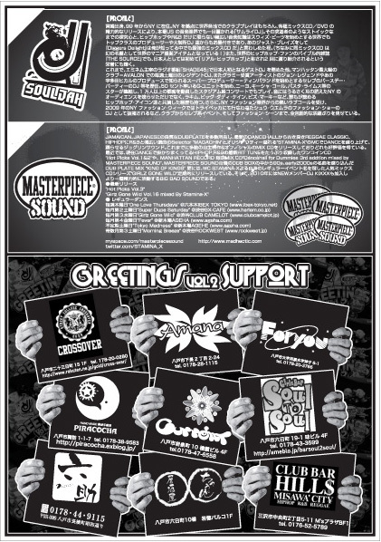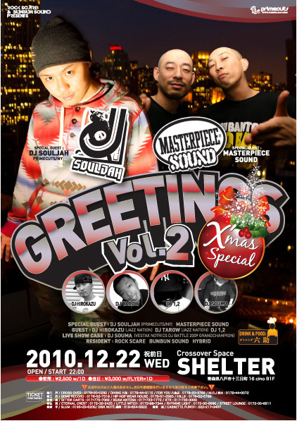 管理人様、告知失礼致します。 今年の3月にスタートし、今回で2回目となるROCK SCARE&BUNBUN SOUNDプレゼンツ "GREETINGS"今回はクリスマス前日という事もあり、スペシャルな内容で皆様をお待ちしております。 まずは! 都内で数多くのレギュラーイベントをこなし、名実ともに東京を代表するBIG BAD SOUND "MASTERPIECE SOUND"、そして今回東北初登場!数々のトップアーティストと競演し、今やNY、そして全米を沸かせている侍DJ"DJ SOULJAH"をスペシャルゲストに、県内を代表するアーティストを迎えての盛り沢山な内容となっております!更にドリン