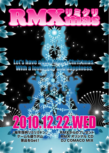 みなさ〜ん 寒くなって参りましたが、元気にお過ごしでしょうか 今年も残すところ、一ヶ月。風邪などひかず、元気に過ごしたいですね さて、今年一年を締めくくるRMX最大イベント RMXクリスマスパーティー RMXmas『リミクリ』 今年も開催いたしまっす 日時:12月22日(水・祝前日)PM8時〜 内容盛り沢山、毎年恒例リミリミドンもやっちゃいます。 ふるってご参加くださいませ 他にもいろいろ企画中お楽しみに テツコママはじめ、スタッフ一同、心よりお待ちしておりま