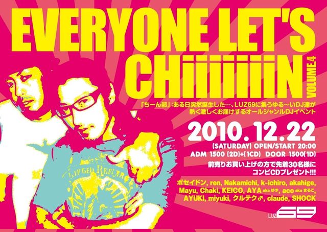EVERY ONE LET'S CHiiiiiiiiiiiiN vol.4 [オールジャンル] ■2010.12.22 ■OPEN / START 20:00- ■@LUZ69 ■DJ ポセイドン ren Nakamichi k-ichiro akahige Mayu Chaki KEICO AYA aka ゆず aco aka まるこ AYUKI miyuki クルテク♂ claude SHOCK ■ADM 1500 (2D) + (1CD) ■DOR 1500(1D) ☆前売りお買い上げの方で先着30名様にコンピCDプレゼント!!! Limitation 30 ☆ [ちーん部] : ある日突然誕生した...。 LUZ69に集うゆる〜いDJ達が熱く激しくお届けする そんなオールジャンルDJイベント