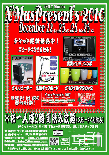 X'mas Present's 2009 ,D.TMama 12月22(水)、23(木)、24(金)、25(土) 上記4日のみOPEN pm8:00〜am3:00 今年もやります!クリスマス特別企画、なんと2時間呑み放題で お一人様3000円さらに来店と同時にくじ引きを引いてなんと 三名様に豪華景品プレゼント! 今年は数もそろえ)何があたるかお楽しみ! 豪華景品が外れてもオリジナルマグカップ等、空クジなし 今年の2010'年クリスマスは、呑んだくれましょう。 友達お誘いの上お待ち申し上げます。 飲み会もよし、カップルもよし、.... チケット絶