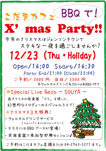 今年のクリスマスはジョンソンタウンで ステキな一夜を過ごしませんか? イルミネーション輝くアメリカンタウンとテラスでのBBQ。 最高のロケーションの中、西アフリカの弦楽器「コラ」の 幻想的なスペシャルライブが実現! ■Party Info■ Date/2010/12/23(木・祝) Place/【こだまカフェ】@入間・ジョンソンタウン http://tounkywoodworks.com/ Open/16:00 Start/16:30 Party End/21:00 (Close/23:00) Special Live Gest/ SOUYA ご予約/3000円 当日/3500円(ウェルカムドリンク&1D