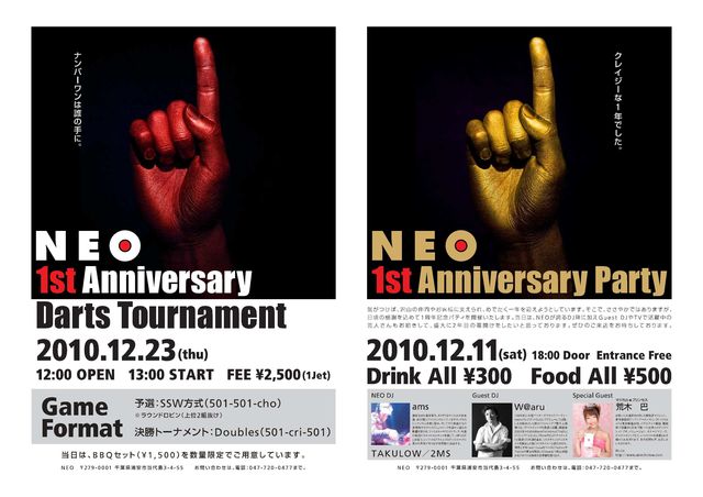 店を始めて一年でやっとトーナメントを開催できることになりました! せっかくダーツがあるのにイロイロな問題点があり出来ていませんでしたが、満を持して開催いたします!!!!もうすでに何名か参加の言葉頂いてますし、勝手にメンバーインしてる人(ム○タとかリコピンとか・・・・)もいますがまだまだ枠はあるのでお願いします!! NEO 1st Anniversary Tournament 12/23 12:00 entry 13:00 START Fee \2,500-1JET付き 定員32名 完全feeバック!そしてノベルティ作れなそうなので、eden商品をだしちゃいます!