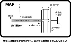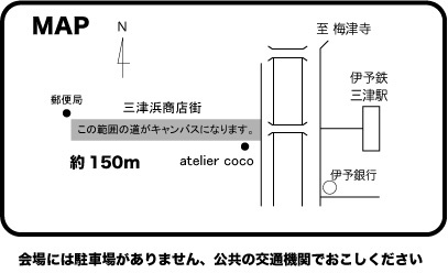 atelier coco presents Merry Xmas!!! 12/23(木・祝日) PM12:30~16:00 三津浜商店街が大きなキャンバスになります みんなで絵を描いて素敵な道にしよう!! (雨の場合は26(日)に順延です) 三津浜商店街の中の道路に、みんなでおもいっきり絵をか きましょう!きっと世界でいちばんの道ができあがります! 参加費 500えん(材料代として)6歳以下のこどもは親子で500えん 当日のながれ 12:30〜 受け付け開始 13:00〜 スタート 16:00〜 片付け 画材のチョーク等はこちらで用意いたします