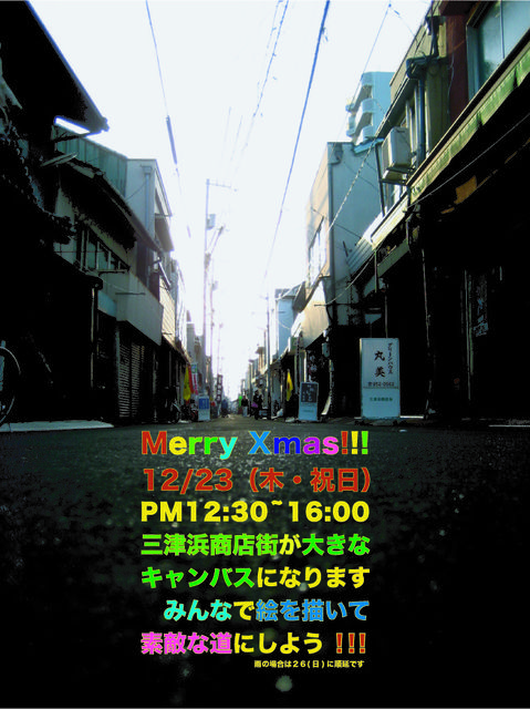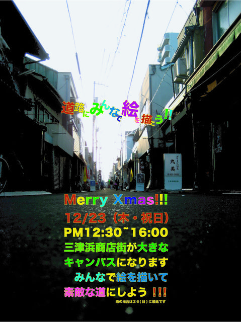開催日時 2010年12月23日(12:30から16:00まで) 開催場所 愛媛県(松山市三津浜商店街) はじめまして、僕は三津浜商店街でアトリエ・ココという造形教室をやっているものです。 告知させてくださいーー atelier coco presents Merry Xmas!!! 12/23(木・祝日) PM12:30~16:00 三津浜商店街が大きなキャンバスになります みんなで絵を描いて素敵な道にしよう!! (雨の場合は26(日)に順延です) 三津浜商店街の中の道路に、みんなでおもいっきり絵をか きましょう!きっと世界でいちばんの道ができあがります!