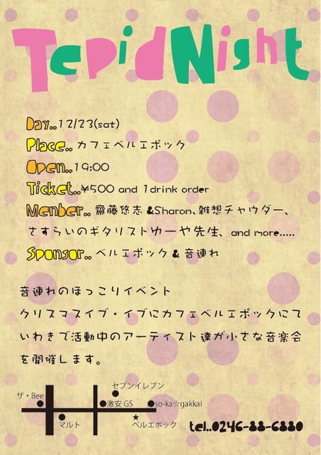 告知失礼します。 12/23(祝)カフェベルエポックにて、クリスマスイベント開催します☆ いわき市で活動中のアーティスト達が、ゆる〜いアコースティックライブを提供。 ウッディーなゆる〜くてかわいいカフェで、ステキな音楽と共に、クリスマス前夜祭します♪ みんな大勢で、楽しくパーティーできたらなって思ってます☆ とってもいい雰囲気のCafeなんで、くつろぎながら皆で楽しく過ごしましょう\(^▽^)/ 『Tepid Night』@Cafe ベルエポック open 19:00〜 ¥500 and 1 drink order 当日のドリン