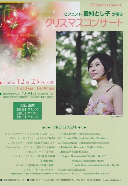管理人様貴重なスペースをお借りいたします。 みなさん!こんにちは 瑞浪市出身の愛知とし子です 毎年、多治見ではファミリーコンサートを定期開催させていただいてますが、7年ぶりに地元の瑞浪でもコンサートを開催することになりましたので、ご案内させてください! 誰もが知っている珠玉の名曲を聴きながら、素敵なクリスマスのひとときを過ごしませんか? ピアニスト愛知とし子が贈る「クリスマスコンサート」 ◇日時:2010年12月23日(木・祝) 【開場】13:30 【開演】14:00