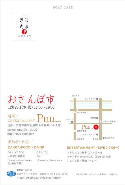 おさんぽ市というイベントにマトリョミン演奏で参加させて頂きます。 演奏は14時からと17時からの予定です。 おさんぽ市 12月23日(木・祝)11:00〜18:00 場所/CAFE&GALLERY Puu... 住所/広島市南区金屋町9-5和興ビル2階 http://puu-cafe.com 参加者(予定)/ ZAKKA・FOOD ・ DRINK 84(ハチヨン) 大田設計事務所 nice nonsense books(出張古本屋) くらしびと Puu... hidamari×chiemi sara ENTERTAINMENT/LIVE(17:00〜) マトリョミン奏者 佐々木みゆき キャンドル chiemi sara(5:9gradi luci) シュシ