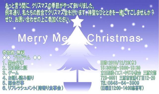 三原のクリスマス会案内です! みなのユニットでもすると思いますが予定会えばご参加よろしくね! いっぺん通りの案内 あっと言う間に、クリスマスの季節がやってまいりました。 例年通り、私たちの教会でクリスマス会を行います。 神聖なクリスマスを一緒にすごしませんか? ぜひ、お誘い合わせの上ご参加ください。 参加費:無料 ◆◆ プログラム ◆◆ 1、開会行事 2、賛美歌と証 3、ゲーム 4、お話し読み語り 5、閉会行事 6、リフレッシュメント(持寄り食事会) 日時:2010/12/23(木) 15:30受付-16:00-18:30