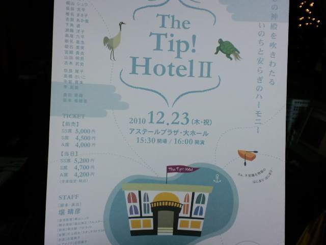 師走になりましたですよ。 みなさま、いかがお過ごしですか〜? お忙しいですよね〜? まぁ、師という職業も、それはそれで地味にやっておりますしーシュですが 実はそれどころではなく走りまくっておりまして。 今年は、なんたって、おっきな舞台を抱えておりますのです! --------------------------------------------------- 『 The Tip! Hotel 2 』 12月23日(木祝) アステールプラザ 大ホール OPEN/15:30 START/16:00 前売りチケット SS席¥5000 S席¥4500 A席¥4000 ----------------------------------