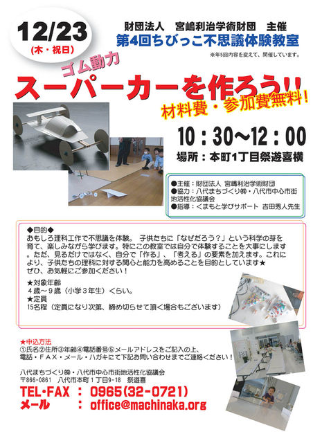 こんにちは!! クリスマス★★★ 本町アーケードで、子供さん向けのイベントを開催いたします! 材料費・参加費無料( ^-^)ノ(* ^-^)ノ お子さんの探究心や創造力を育むためのイベントです☆ ぜひご参加くださいませ!! -*-*-*-*-*-*-*-*-*-*-*-*-*-*-*-*-*-*- 12月23日(木:祝日)10:30-12:00 場所:本町アーケード 本町1丁目祭遊喜横 財団法人 宮嶋利治学術財団 主催 第4回ちびっこ不思議体験教室 【ゴム動力・スーパーカーを作ろう!】 ☆ゴム動力のスーパーカーを作ります★