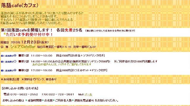 落語の演じ手があまりにも美味しそうに食べたり飲んだりすると、観客もそれにつられてしまうことがあります。 それなら!と「落語」と「飲食」を一緒に楽しんでもらえる『落語cafe(カフェ)』を開催してみたくなりました。 http://www.bb.soma.or.jp/~kanchan/index.html 開催日 2010年12月23日(祝木) 会 場 シェアCafeBar 仙台市青葉区一番町2-5-15 共栄一番町ビル3F ■第1部 11:00〜13:00 料金1500円[お弁当+ソフトドリンク付き] ■第2部 14:00〜16:00 友の会会員限定(無料※別途ワンドリンク(500円) ※