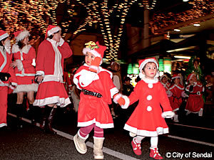 たくさんの市民がサンタクロースやトナカイに変身して 定禅寺通をパレードします。 「サンタの森の物語」は、多くの市民やマーチングバンドの方々に参加して頂き、 皆様に楽しんでもらえるような「夢」のあるイベントです。 心に残る一日になればと願っております。 各ブースでは、音楽演奏やダンスなどの演技も行われ見どころもいっぱいです。 愉快なサンタクロースたちが冬の街を明るく楽しく盛り上げます。 ○開催日 12月23日(木、祝) ○時間 17:30〜19:40(※交通規制17:00〜20:00) ○場所 定禅寺通(東二番丁通〜晩翠通