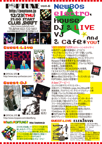 <本日12/18 A-beeさんのリリパ 大成功を願っています!!!> クリスマスイブイブ。・ * 仙台では年末をしめくくるにふさわしい POPTUNEの季節がやってきました。・ アットホームでアーティストまでも 友だちになれる気軽さが人気です♪ ●○POPTUNE○● http://poptune.jp/ ポップさをわすれないパーティとして、 カフェ・空間・サウンドの融合を目指し 2010年2月にSHAFTで再始動。 今回は1年の集大成となるべく、 もっともハッピーなpartyの幕があがります! FAMICOM世代を代表する SEXY-S