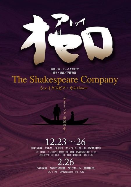 昨日、シェイクスピア・カンパニーさんの プレビュー公演『アトゥイ オセロ』を見てきました http://www.shakespeare-company.net/ 実は講演会に いつもお世話になっている フォトリーディングの笹氣健治先生が http://www.1po.jp/photoreading/index.html 出演されているということで 大崎まで行ってきました。 (3枚目の写真の右側の方です。) 原作のオセロから作り込まれたストーリーと 笹氣先生を含め、皆さんの迫真の演技に感動しました なお仙台公演については、こちら http://www.shakespeare-company.net/