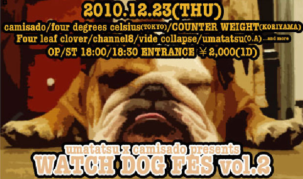 ■2010/12/23 (THU) 仙台 LIVE STUDIO RIPPLE TEL 022-246-8186 umatatsu × camisado presents [ WATCH DOG FES vol.2 ] w/ COUNTER WEIGHT / camisado / Four leaf clover / channel8 / vide collapse / [O.A]umatatsu / and more... OPEN 18:00 / START 18:30 ADV&DOOR 2000+D チケットのご予約はこちら info@4c-cid.com ※件名に"チケット予約"、本文に"日程"、"お名前"、"必要枚数"をお願い致します。