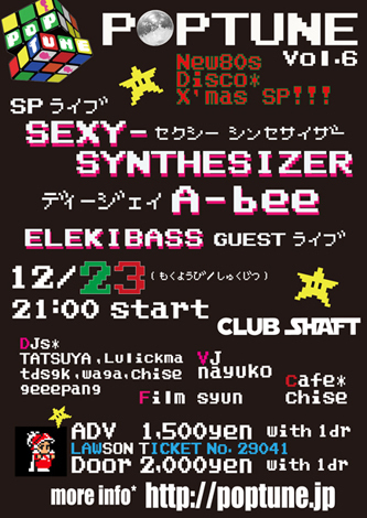 クリスマスイブイブ。・ * 年末をしめくくるにふさわしい POPTUNEの季節がやってきました。・ ●○POPTUNE○● http://poptune.jp/ ポップさをわすれないパーティとして、 カフェ・空間・サウンドの融合を目指し 2010年2月にSHAFTで再始動。 今回は1年の集大成となるべく、 もっともハッピーなpartyの幕があがります! FAMICOM世代を代表する SEXY-SYNTHESIZER 12/8 3rd Albumを発売したA-beeのキラやかなサウンドと DJ-mixスタイルは男女ともに必見!!! そしてイギリス生まれ渋谷経由、USインディ/オ