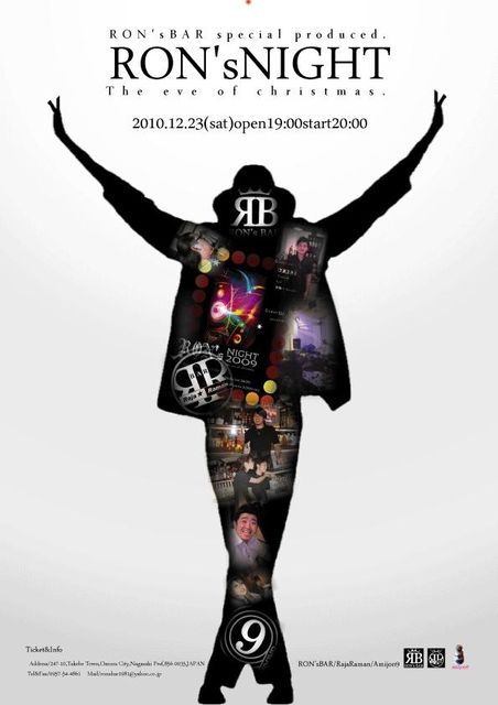今年もやって参りました『RON'sNIGHT2010』 今年のロンズナイトは、ライブあり!ダンスあり!プレゼントあり! と沢山のイベントがあります!! 時間 start20時(open19時)〜close24時 会費 男性3500円 女性3000円(飲み放題・歌い放題) 出演者 相良 陽平 白濱 大樹 森田 聡 林田 美和 西方神起(あの韓国アーティストグループ?) RNB7(秋葉原出身アイドルグループ?) イベント最後に一万円分の豪華景品があたる抽選会開催!!